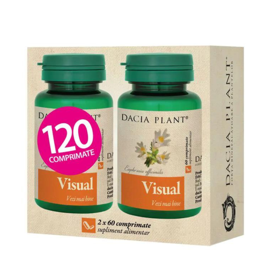 Te confrunti cu oboseala ochilor sau o senzatie de disconfort vizual? Pachet Visual, 2 x 60 comprimate, Dacia Plant este un supliment alimentar natural, conceput pentru a sprijini sanatatea ochilor si a vederii, oferind un sprijin valoros in ritmul alert al vietii moderne.