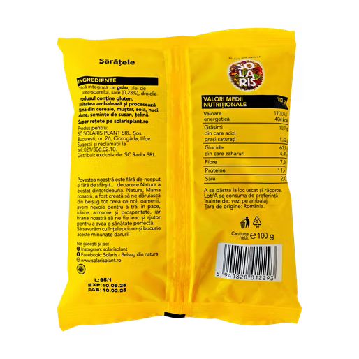 Cauti o gustare simpla, autentica si fara compromisuri, care sa-ti satisfaca pofta de sarat? Descopera acum Saratele, 100 g, Solaris, alegerea ideala pentru momentele in care doresti un snack crocant, natural si plin de savoare, creat cu ingrediente atent selectionate.